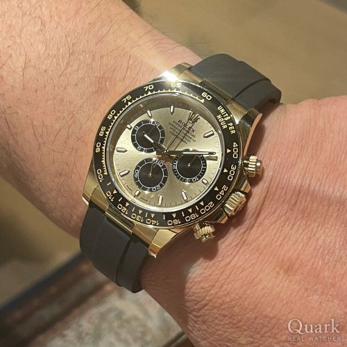 この度、コンビのエル・プリメロ搭載デイトナをご選択いただきましたこと、私自身とても新鮮で、そして大変嬉しく感じております。エル・プリメロは「デイトナ初の自動巻き」として広く知られておりますが、実はデイトナ“初のコンビモデル”でもあり、歴史的にも非常に意義深い存在でございます。昨今、バイカラーの魅力が改めて評価される中で、この独特の華やかさとスポーティさを兼ね備えた雰囲気は、まさに今の時代にも響く1本だと存じます。