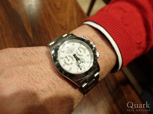 O様 この度はクォーク銀座店デイトナサロンをご利用いただき誠にありがとうございます。タイミングよく、お気に召していただく商品がご案内出来ましたこと、私も嬉しく存じます。Ref.116500LNのホワイトダイヤルですが、通称「パンダダイヤル」とも呼ばれるデザインが、登場から現在まで変わらず人気がございます。人気の衰えがみられませんから、O様も仰っていた通り、使って良し、持っていて良しのモデルだと私も考えております。また何かお探しのデイトナがございましたらお気軽にご相談ください。今後とも末永いお付き合いの程、よろしくお願いいたします。