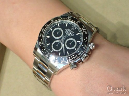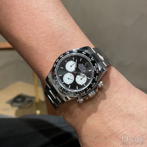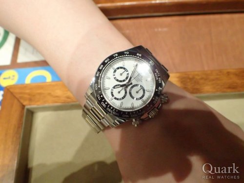 W様 この度は数ある時計店の中からクォーク銀座店をご利用いただき誠にありがとうございます。大人気シリーズ、DAYTONA Ref.126500LN(白)のご購入おめでとうございます!ずっと探されていたモデルとの事でしたので年式の新しい商品をタイミング良くご案内出来た事、嬉しく思います。前モデルに比べ、文字盤は、バーインデックスが細長い形状となり、インデックスの枠も細くなっております。また、夜光部分の面積が拡大し、夜間の視認性も向上。近年のロレックスに見られる6時位置のSWISS MADE間に王冠マークが印字される仕様も採用されているのが良いですね!ブレスレットの洗浄及び調整も無料で行っておりますので、お近くにお越しの際は遊びにいらしてくださいませ。お使いいただく上で何かご不明な点等ございましたら、また林までご相談ください。今後とも末永いお付き合いの程よろしくお願いいたします。
