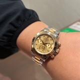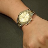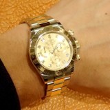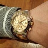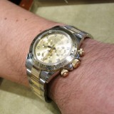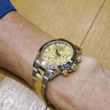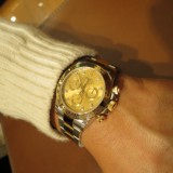大きなサイズの時計を探しており、スタンレスのデイトナとも迷いましたが、コンビ素材でダイヤルにダイヤついたこのモデルが、女性が着けてもかわいいいデイトナだると思い購入を決めました。