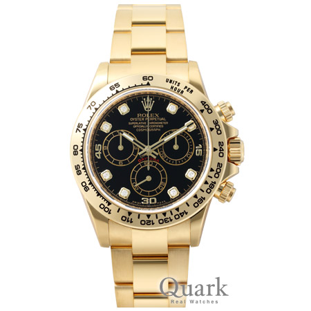 金無垢のデイトナでしか味わえない高級感に惹かれて購入を決断致しました。またブラックダイヤルと8Pダイヤの組み合わせもとても綺麗だと感じました。
