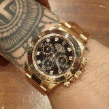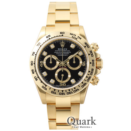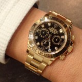 金無垢のデイトナでしか味わえない高級感に惹かれて購入を決断致しました。またブラックダイヤルと8Pダイヤの組み合わせもとても綺麗だと感じました。