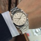 彼女のプロポーズ用のシンプルな白かシルバーの文字盤を探しており、彼女の生まれ年のエアキングが奇跡的にあると担当の久保さんに教えていただき購入に至りました。現物を見て絶妙な灼け具合とサイズ感…