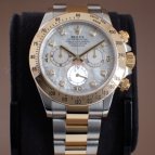ダイヤルには希少なホワイトシェルに8Pダイヤモンドが入っており、華やかな雰囲気のコンビデイトナ Ref.116523NG。こちらは2009年製のモデルです。