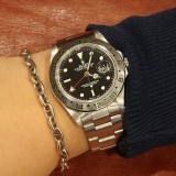 ホワイト文字盤のスポーツモデルが欲しかったのですが、種類は意外と少なく、デイトナは予算オーバーで手頃なものを探していたところエクスプローラーIIを発見。現行モデルとも悩みましたが、私の手首にフィットするのはコチラでした。ホワイト文字盤は清潔感があって、スーツにも合わせやすく重宝しています。