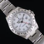 ホワイト文字盤のスポーツモデルが欲しかったのですが、種類は意外と少なく、デイトナは予算オーバーで手頃なものを探していたところエクスプローラーIIを発見。現行モデルとも悩みましたが、私の手首にフィットするのはコチラでした。ホワイト文字盤は清潔感があって、スーツにも合わせやすく重宝しています。