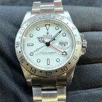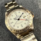 ホワイト文字盤のスポーツモデルが欲しかったのですが、種類は意外と少なく、デイトナは予算オーバーで手頃なものを探していたところエクスプローラーIIを発見。現行モデルとも悩みましたが、私の手首にフィットするのはコチラでした。ホワイト文字盤は清潔感があって、スーツにも合わせやすく重宝しています。