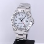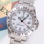 ホワイト文字盤のスポーツモデルが欲しかったのですが、種類は意外と少なく、デイトナは予算オーバーで手頃なものを探していたところエクスプローラーIIを発見。現行モデルとも悩みましたが、私の手首にフィットするのはコチラでした。ホワイト文字盤は清潔感があって、スーツにも合わせやすく重宝しています。