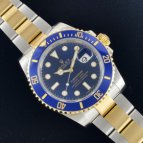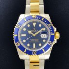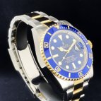 Ref.16613の次期モデルとして、デザインは受け継ぎながらも、耐蝕性と、耐傷性に優れたセラミックベゼルを搭載し、2009年に誕生したサブマリーナーがこのRef.116613LB。通称“青サブ”と呼ばれ、数多くある18Kコンビモデルの中でも、人気・知名度ともに非常に高いモデルである。水深300m(1,000フィート)でも信頼性と精度が保証されるといった長いサブマリーナーの歴史を受け継ぎながらも、随所に新しい技術を取り入れ、サブマリーナー・コンビ史上、最も高級感の溢れるデザインと耐久性で確固たる人気を築いている。ケースラグ部分の大型化によりさらに耐久性を高め、独自開発されたブルーパラクロムヒゲゼンマイの採用で耐磁性・耐衝撃性が向上。ベゼルにはイエローゴールドの特殊コーティングが施された60分の目盛りが刻まれ、潜水時間と減圧停止を正確に測定することが可能。ブレスレットは、前モデルでは中空だった中央のリンクパーツがソリッドパーツに変更され堅牢性がアップ。バックルは堅牢性、高級感、実用性といったあらゆる面から改良が加えられた新型バックル、グライドロッククラスプを採用。使用者本人が工具無しでもブレスの長さ調節が容易にできるようになった。また発光時間もルミノバ夜光塗料の約2倍(8時間)という長さのクロマライトを採用するなどサブマリーナーはダイバーズウォッチとして進化し続けている。