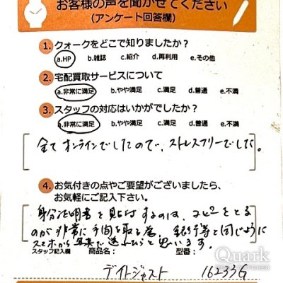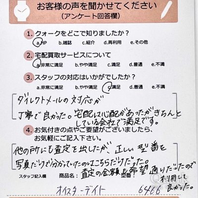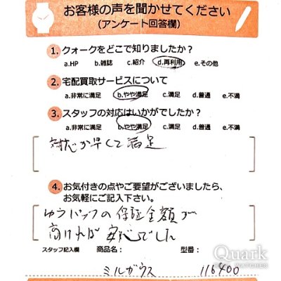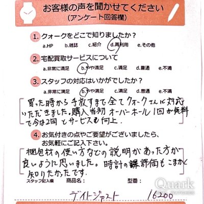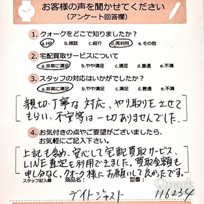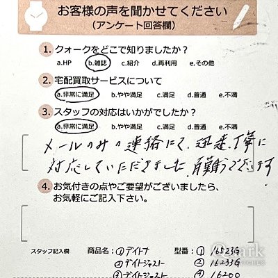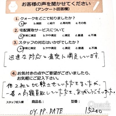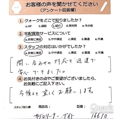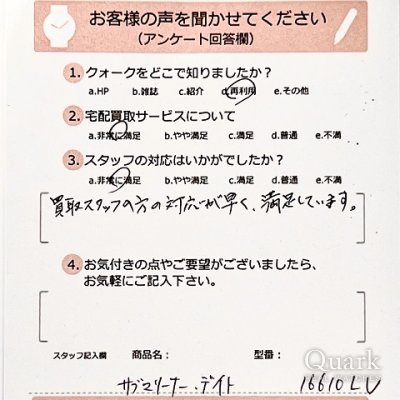 スタッフの対応も良く迅速な対応でした。又希望の買取額で満足です。もし又ロレックスを買入する機会があればクォークで買いたいと思います。