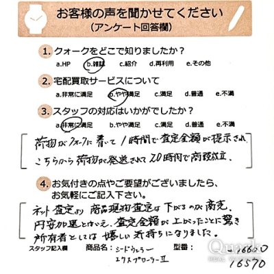 迅速で丁寧な対応して頂きありがとうございました。エクスプローラーIは最高の時計です。大好きでした。クォークさんはとても安心できるし信頼しています。また購入するときや買取りするときはよろしくお願いします。