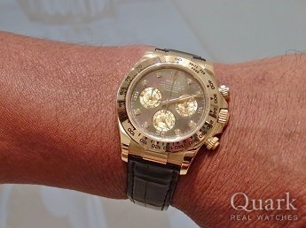 Y様 この度はクォーク横浜店でのご購入誠にありがとうございました。下取りならびご購入では何とかご希望に沿えたようでホっとしました。ブラックシェルの色合いがとてもキレイで、同じブラックシェルユーザーとしては嬉しい気持ちでいっぱいです!インダイヤルのゴールドクリスタルとブラックシェルの組み合わせが実にカッコイイです。Y様がこだわっていた理由も納得です!イエローゴールド、ダイヤモンド、ブラックシェル、と贅沢の極みとも言えるデイトナの豪華さも上回るY様の貫禄に圧倒されました。とても似合っていて嬉しいです。近くにお越しの際はお立ち寄り下さいね。これからも長いお付き合いの程、宜しくお願い致します。 クォーク横浜店 長本・横尾