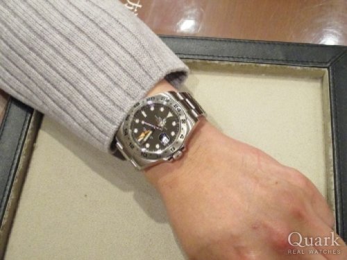 H様 日頃より私共クォークをご利用頂き、誠に有難う御座います。やはり42ミリのサイズは、存在感がありますね。このサイズながら、厚みは感じられず、本当に普段使いにご満足頂けるデザインだと思います。また、H様の仰られます通り、初代EX-II の意匠を受け継いだ24時間針等のデザインと、大きくなったインデックス等、伝統と新しさを同時に楽しんで頂けるモデルですね。オレンジの色もアクセントとして絶妙ですし、周りの方とのロレックスのお話もまた楽しくなりそうですね。今回お求め頂きましたEX-II で、更にロレックスをご愛用頂く楽しみが増えます事を願っております。また、目新しモノや珍しいモノ等、H様へご案内させて頂きますので、気になるモデル等が御座いましたら、是非ご連絡ください。最後になりましたが、これからも、H様のお気持ちに応えられますよう、スタッフ一同努めて参ります。お時間が御座います際にはお気軽にお問い合わせを頂けましたら幸いです。今後とも、どうぞ、宜しくお願い致します。 クォーク仙台店 麻生