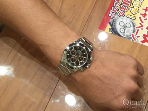 N様 この度はクォーク新宿店にてお時計をご購入頂きまして、誠にありがとうございました。ご購入頂きましたデイトナは極めてステイタス性が高く、多くの方の憧れの的となっているモデルでございます。生産中止が発表されたモデルでございますので、今後の動向にも注目しながら、末永くご愛用頂けましたら幸いでございます。仲の良いN様ご夫婦とお話をさせて頂き、私も楽しい時間を過ごすことが出来ました。あまり新宿にはいらっしゃらないとのことでございましたが、お近くにお立ち寄りの際には、お気軽にクォーク新宿店までお越し下さいませ。