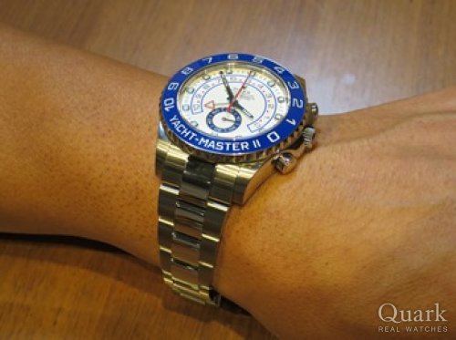 O様 この度は当店をご利用下さいまして誠にありがとうございます。迫力のある44mmケースにレガッタ・クロノグラフが搭載されたヨットマスターⅡはO様がおっしゃられる通り、独特なデザインが魅力的なモデルです。ぜひ、末長くご愛用頂けましたら幸いでございます。ご使用頂く上で何か気になる点やご相談等ございましたら、お気軽にお申し付け下さい。お近くへお越しの際には遊びにいらして下さい。クォーク上野本店 佐藤