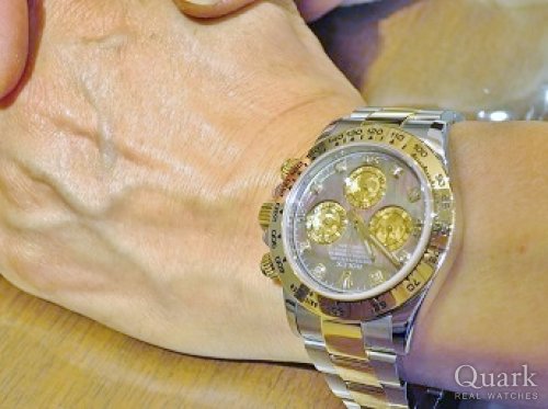 この度は、クォーク横浜店にてご購入頂きまして誠にありがとうございました。2つのシェル文字盤を同時にご覧いただく事が出来て、ご紹介させて頂いた私自身も驚きです!本当にラッキーだったと思います!シェル文字盤のデイトナは流通が少なく、しかもイエローゴールドのコンビタイプとなると、その数はかなり絞られてきます。それに加えて今年の新型モデルですから、とても良いタイミングでご購入いただいたと思います。ブラックシェルは私も所有している分、魅力も十分に理解していますし、個人的にも大好きな文字盤です。このオーロラのような美しくて迫力のある文字盤は、飽きる事なくご愛用いただけると思います。H様に大変似合っておられたのが何よりも嬉しいです!H様の笑顔と大満足で帰っていかれた姿に私も大大大満足でした!ありがとうございました。ブレスレットのお掃除はいつでも承っておりますので、横浜駅にいらした際には、是非お立ち寄りくださいませ。またお会いできる日を楽しみにしております。今後ともよろしくお願い致します。