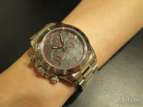 N様 この度は数ある時計店の中からクォーク梅田店をご利用頂きまして誠にありがとうございます。お求め頂きましたホワイトゴールドのデイトナは存在感が抜群ですね。マットブラックのダイヤルに赤針がより一層引き立ちデザイン的にも完成度の高い1本ではないでしょうか。ご使用方法など、ご不明な点などございましたらいつでもご連絡下さいませ。今後とも宜しくお願い致します。クォーク梅田店 羽場