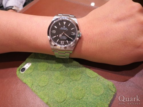 S様、この度はクォーク梅田店をご利用頂きまして誠に有難うございます。今回お選び頂いたエクスプローラーI Ref.214270の魅力はなんといってもシンプルなデザインのカッコよさですね。2016年に新しいダイヤルとして発表されたこちらのモデルは流通量が少ない事で知られていますが、S様がお立ち寄り頂いたタイミングでご案内させて頂く事が出来て私もとても嬉しいです。是非末永くご愛用くださいませ。またのご来店を心よりお待ちしております。