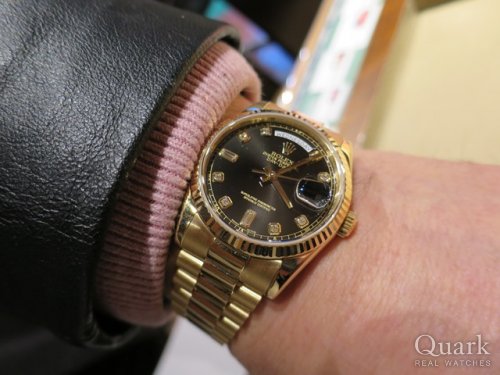 H様 いつもクォ―ク上野本店をご利用頂き誠にありがとうございます。本年も宜しくお願いいたします。前回のピンクゴールドのデイデイトに続き、今回はデイデイト Ref.118238Aブラックダイヤルのご購入のお手伝いが出来た事、大変嬉しく思います。前回同様に日付表示に加え、曜日表示を備えるデイデイトは金無垢モデルのみで展開され、ロレックスの最高峰モデルとしていつの時代も多くの方が憧れを抱いている人気が高いデイデイトです。今回は10ポイントのダイヤが更に目立つ黒文字盤の為、高級感を存分に楽しんで頂けるお時計かと思います。ご使用頂きしっかりとサポートさせて頂きますのでまた、お時計の事で何かございましたらお気軽にご相談下さいませ。また東京に来られた際は遊びにいらして下さい。宜しくお願いいたします。
