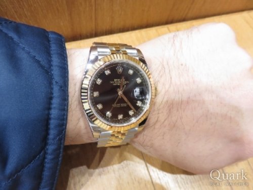 M様、いつもクォーク神戸店をご利用頂きまして誠に有難うございます。お選び頂いたブラック文字盤の10Pダイヤは、18金イエローゴールドコンビとの相性も抜群で男らしい雰囲気がM様にピッタリです。こちらは、2016年に発表されたばかりの新型モデルで、ムーヴメントが改良されて格段に性能面も良くなっています!まさに一生モノとして相応しい1本ですので、末永くご愛用下さいませ。またのご来店心よりお待ちしております。クォーク神戸店 増田