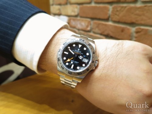 T様、この度はクォーク神戸店をご利用頂きまして誠に有難うございました。今回ご購入頂きましたエクスプローラーⅡRef.216570(黒)は、全ロレックスのバリエーションの中でも大きめの42ミリのケースサイズが魅力で、ガッチリとされているT様にまさにピッタリのモデルでございます。T様のおっしゃられますように、全体的なサテン仕上げは傷などが目立ちにくい点でもとても良いですし、黒文字盤はシンプルで使いやすく様々なシーンで活躍してくれると思います。T様の雰囲気や服装にもぴったりでとてもカッコ良かったです!!末永くご愛用頂けましたら幸いです。今後もご指名頂けるようしっかりとサポートさせて頂きますので、何かご要望などございましたら私井内までお申し付け下さいませ。また、ブレスレットの洗浄及び調整も無料で行っておりますので、お近くに来られた際には是非遊びにいらして下さい。心よりお待ちしております。 クォーク神戸店 井内