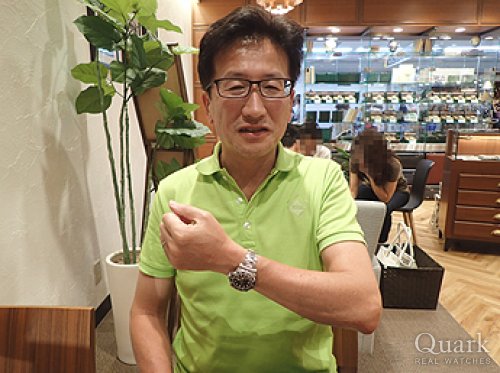 A様 この度はクォーク名古屋店をご利用頂き、誠にありがとう御座います。またご遠方よりお越し頂き、重ねて御礼を申し上げます。GMマスターII 青黒やサブマリーナーとも悩まれましたが、A様が仰る通り、長い目で見て頂くと合わせ易さや飽きの来ないのは、ブラックベゼルだと思います。また高級感を感じられる鏡面仕上げのブレスレットやロレックスカラーのグリーンも魅力的に感じますね。ON・OFF問わずビジネスでもご愛用頂けるデザインとなりますので、これから沢山ご愛用頂ければ幸いです。お持ちのブライトリングと共に使い分けを楽しんで下さい。今後も御時計のご相談などが御座いましたら、ご遠慮なく私までお申し付け下さいませ。お近くにお立ち寄りの際は、ブレス洗浄を兼ねて遊びにいらして下さいね。またA様にお会い出来る日を楽しみにしております。