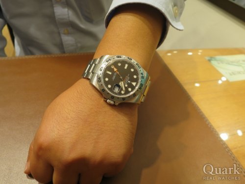 K様、この度はクォーク梅田店をご利用頂きまして誠に有難うございます。今回お選び頂きましたエクスプローラーII Ref.216570は数あるスポーツモデルの中でも比較的大きな42ミリケースを採用しており、見た目のインパクトは絶大です。オレンジの24時間針がアクセントとなっており、デザインの評価も非常に高いモデルです。K様が末永く安心してご使用頂けるようにしっかりとサポートさせて頂きますので、何か気になる点がございましたらお気軽に仰ってくださいませ。またのご来店を心よりお待ちしております。