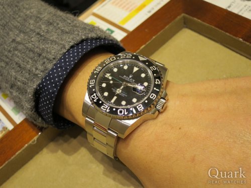 N様 いつも弊社をご利用下さいまして、誠にありがとうございます。今回ご購入下さいました現行型GMT-MASTERIIはブラックべゼルとグリーンカラーの組み合わせにより、落ち着きのあるデザインとなっております。プライベートからビジネスまで幅広く対応可能でございますので末永くご愛用頂けましたら幸いでございます。今後とも何かご相談等ございましたら、お気軽にご連絡下さい。お近くへお越しの際ではぜひお立ち寄り下さいませ。どうぞ宜しくお願い致します。クォーク銀座888店 佐藤