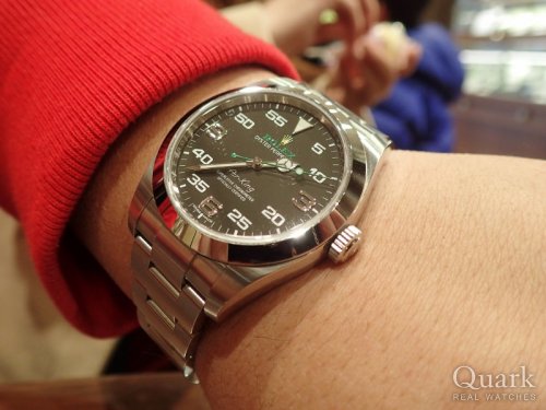 U様 この度は、私共クォークをご利用頂き、誠に有難う御座いました。現在のエアキングは、見た目のインパクトや機能性等、これまでのエアキングとは全く異なり、とても新鮮な感じがしますね。U様の仰います通り、グリーンの秒針とイエローの王冠マークは他のモデルにはないデザインで、見ているだけでも楽しいモデルです。40ミリと大きくなったサイズも存在感がありますので、是非、新しいロレックスの魅力を存分に楽しんでください。また、当日はお会いする事が出来ずとても残念でしたが、近くにお越しの際は、ブレスレットのクリーニングも兼ね、是非お立ち寄りください。次回お会い出来ます日を楽しみにお待ちしております。その時には、新しいエアキングの感想等も聞かせて頂けましたら嬉しく思います。安心してご愛用頂けますよう、しっかりサポートさせて頂きますので、ご不明な点等が御座いましたら、お気軽にご連絡ください。今後とも、末長いお付き合いの程、どうぞ、宜しくお願い致します。 クォーク仙台店 麻生