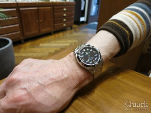 T様、この度はクォーク神戸店をご利用頂きまして誠に有難うございました。ご購入頂きましたモデル、Ref.116900は、これまでミルガウスだけに採用されていたCal.3131を搭載し、2016年に満を持して復活を遂げた現行エアキングです。機械的な部分だけではなく、デザインも一新され、とてもお洒落になっております。実用性抜群の帯磁モデルですので、様々な場面でお使い頂ける事と存じます。T様にとてもお似合いでございました。末永くご愛用頂けましたら幸いです。今後もご指名頂けるようしっかりとサポートさせて頂きますので、何かご要望などございましたら私井内までお申し付け下さいませ。また、ブレスレットの洗浄及び調整も無料で行っておりますので、お近くに来られた際には是非遊びにいらして下さい。心よりお待ちしております。