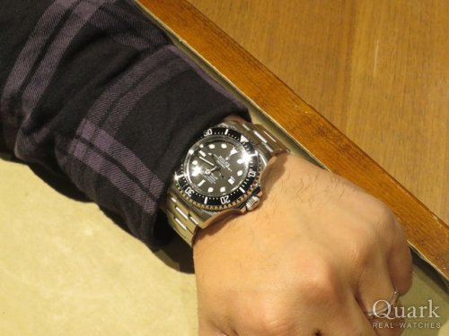 S様 この度は数ある時計店から当店をお選びいただき誠にありがとうございます。今回お選びいただきましたDEEPSEAはロレックスの中でも肉厚ケースで重量感もあり、インパクトは絶大なモデルとなります。S様のがっちりした体格、腕にピッタリなモデルかと思います。横から見た時のケースは何とも言えない存在感ですね。是非末永くご愛用頂けましたら幸いです。今後とも宜しくお願い申し上げます。 クォーク上野本店 矢島