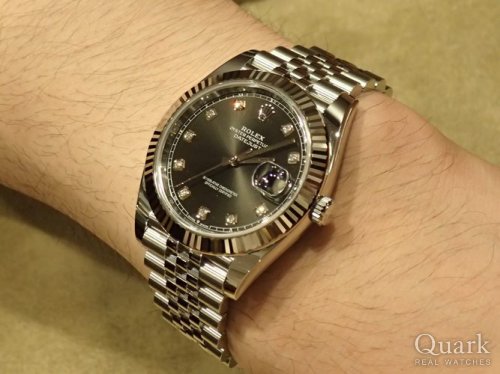 F様 この度はクォーク仙台店をご利用くださいまして誠にありがとうございます。また、ご遠方よりお越し頂きましたこと、改めて心より御礼申し上げます。やはり直接見て、着けてみないとわからないことってたくさんございますね。まさか、決めていらっしゃったデザインとは違う答えになるとは、おそらくF様ご自身が一番びっくりされたのではないでしょうか。でも、ご試着いただいたときから大変お似合いでございましたよ!F様がお似合いなポイントは、奥様がよく分かっていらっしゃいますので、今回の1本は間違いございません。親子でロレックスというお話も素敵でございますね。お父様にも思う存分自慢してください♪そして、お父様のロレックス欲が湧いてきましたら、いつでもご相談お待ちしております(笑)。F様のロレックスライフがいつまでも続きますよう、今後もお手伝いいたしますので、ご不明点などございましたらいつでもご連絡くださいませ。店頭にてサイズ調整、ブレス洗浄を無料で承っておりますので、お近くにお越しの際はぜひお店にも遊びにきてください。パ〇コに行くついでで構いませんので(笑)。DATEJUST41は41mmのケース径とゴージャスなデザインで、十分インパクトがございます。みんなの視線をあびてしまうかと思いますが、そちらもまたロレックスオーナー様の特権でもございます。大切にご愛用いただき、いつまでも可愛がっていただけましたら幸甚に存じます。それでは今後とも末永いお付き合いのほど宜しくお願い申し上げます。