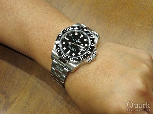 H様、この度はクォークなんば店をご利用頂き誠に有難うございます。ご選択頂きましたモデルは、現行のラインナップから姿を消したブラックベゼルのGMTマスターII。Ref.116710LNは生産終了してからもお問い合わせを多く頂く人気の一本です。サブマリーナーよりもドレッシーで、スーツにも良く合うシーンを選ばないデザインが良いですね!H様の仰るとおり24時間針とモデルロゴの「緑」がこちらのモデルの印象を決めるポイントだと思います。長年お考えだったモデルご購入のお手伝いができ私も嬉しいです!是非末永くご愛用下さい。ご使用頂きご不明な点等ございましたら、お気軽にご相談下さい。また、近くにお越し際はブレスレットの洗浄等お申し付け下さいませ。今後ともクォークなんば店を宜しくお願い致します。 クォークなんば店 山﨑