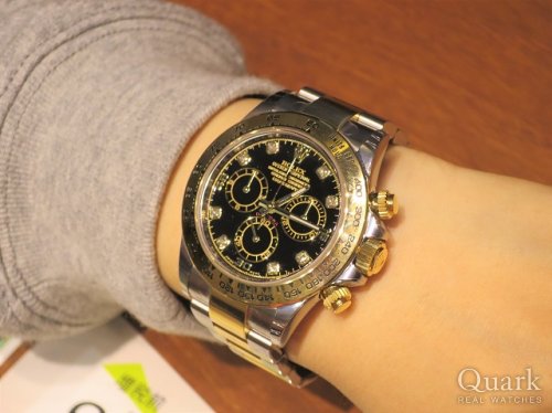 L女士,感谢您和您的朋友再次光临银座店,非常荣幸这次能够为您服务。这款间金黑盘镶钻迪通拿帅气又不失高贵,非常适合您的气质,希望您能够喜欢。同时,“有金有钻(赚)”,相信它也一定能给您带来更多的好运气!