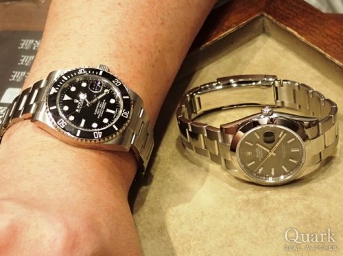 O様 この度はクォーク仙台店をご利用くださいまして誠にありがとうございます。ロレックスのイメージをお伺いしておりました後の、まさかの両方GET、O様の勢いを感じました。ロレックス人気上位のモデル、サブマリーナーは引き締まったイメージがありながらもスポーティなデザインはカジュアル系でもお楽しみいただけることと存じます。まさにO様の期待に応えてくれる一本でございますね!O様の頭の中にもやもや漂っていた、これまでのロレックスのイメージを覆してくれたようで安心いたしました(笑)。これからはロレックス愛をゆっくり育ててください♡私もO様に喜んでいただけますよう、精一杯お手伝いさせていただきますので、なにかお困りのことがございましたら、いつでも私までご相談くださいませ。店頭にてサイズ調整、ブレス洗浄を無料で承っておりますので、お近くにお越しの際はまたお店にも遊びにきてください。O様、ダイバーズモデルは大きめのサイズなので、いろいろとご安心くださいませ(笑)。O様のロレックスライフがいつまでも華やかに続いていきますよう、お祈り申し上げております。お仕事はもちろん、プライベートでもたっぷりご愛用くださいませ。それでは今後とも末永いお付き合いの程よろしくお願い申し上げます。