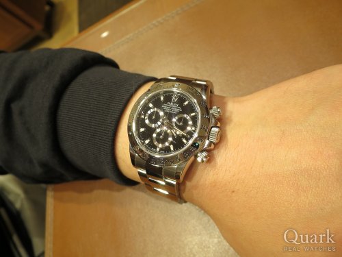 T様、この度はクォーク梅田店をご利用頂きまして誠に有難うございます。念願のモデルを手に入れて頂く事が出来て大変光栄です。今回ご購入頂いたデイトナ Ref.116520は2016年に生産終了となりましたが、その後も現行モデルに引けを取らない人気が続いております。操作方法など何かご不明な点がございましたらしっかりとサポート致しますので、末永くご愛用くださいませ。またのご来店を心よりお待ちしております。