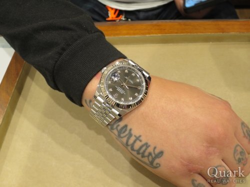 O様、いつもクォークなんば店をご利用頂き誠にありがとうございます。今回はデイトジャストということでしたが、同じモデルでもベゼルや文字盤のデザインが異なるだけで印象がガラッと変わるので難しかったですね!最終的に10PダイヤとなりましたがO様にバッチリお似合いでした!ペアモデルご購入の際も是非ご相談下さいませ。