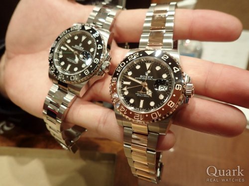 M様 日頃より私共クォークをご利用頂き、誠に有難う御座います。「念願の」と言ってもいいでしょうか、ようやく今回ご覧頂く事ができ、更に「想像以上に良かった」とのお言葉も頂き、とても嬉しく、安心しております。このモデルのカッコ良さは、写真では全く伝わらないですね。息子様にもその想像以上のカッコ良さにお墨付きを頂き、感激してしまいました。有難う御座いました。また、2本並んだGMT-MASTER II 、とっても羨ましいステキな光景ですね。Ref.116710LNは、ロレックスのコーポレートカラーでもあるグリーンの24時間針とモデル表記がシックでカッコ良いモデルですが、この度のRef.126711CHNRは、ブラウン×ブラックの2トーンのベゼル、エバーローズゴールドの柔らかい輝き等、落ち着いた印象で、大人の雰囲気が溢れているステキなデザインになっていると思います。是非、M様には思う存分それぞれの魅力をご堪能頂き、末長くご愛用頂けましたら幸いです。まだまだ先の話になりますが、ご子息様にもご愛用頂く事になりましたら更に嬉しいですね。将来、ご子息様に譲って頂く事ができますよう、しっかりサポートさせて頂きますので、ブレスレットのサイズ調整やご不明な点等が御座いましたら、お気軽にご連絡ください。また、近くにお越しの際には、是非当店へもお立ち寄りください。心よりお待ち致しております。改めまして、この度も誠に有難う御座いました。今後とも、どうぞ、宜しくお願い致します。 クォーク仙台店 麻生