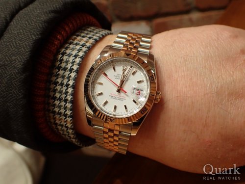 T様 いつもクォーク神戸店をご利用くださいまして、誠にありがとうございます。今回お選びいただきましたターノグラフのコンビモデル Ref.116261は、回転ベゼルを搭載し、スポーティーな印象もありながら、ジュビリーブレスレットと、ピンクゴールドの組み合わせで上品な雰囲気が漂う1本ですね。ホワイトダイヤルは、爽やかでビジネスシーンでも使いやすいかと思いますので、是非ご愛用くださいませ。今後ともクォーク神戸店をよろしくお願い申し上げます。