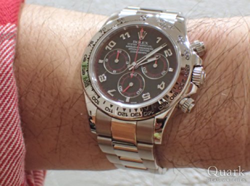 今回クォーク名古屋店に訪れたのが半年以上振りで、久しぶりに遊びに行こうと思い立って訪れたら、前から欲しかったRef.116509 黒アラビアが店頭に置いてある。以前にRef.116520を持っていたが、泣く泣く手放した経緯があり、手放した事に後悔していて、次に時計を買うならWG無垢のDAYTONAにしようと決めていた。今回購入した黒アラビア文字盤は現在製造されて無く、なぜに製造が終わったのか不思議なほど魅力的な文字盤で、黒色をベースに所々アクセントに赤色が使われているのがなんとも言えない魅力で、ついつい時計に心が引き込まれて見惚れてしまいます。実際に時計を着けさせて頂いた時も、ブレス調節でいつも納得のいくサイズに合わせるのが難しく、何度も微調節を繰り返していたのが、今回はサイズ調節無しで、丁度良いサイズに最初からなっていた。まるで私が着けるのを待っていたかのようにピッタリなブレスサイズでした。15年以上前に当時正規店で薦められ、高いから買えないと言っていたモデルが遂に自分の元に、懐かしい思い出と、遂に持てた喜びが交差します。