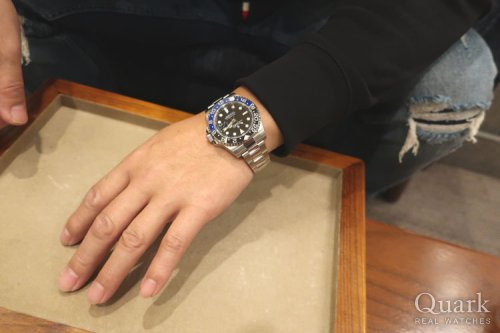 A様、この度はクォーク名古屋店をご利用いただきまして誠にありがとうございます。A様がお選びになられたモデル「Ref.116710BLNR」は、「バッドマン」の愛称で親しまれており、青黒の2トーンカラーベゼルはカジュアル、ビジネスシーン等多様に使える大人気のモデルです。