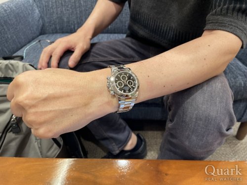 T様 この度は数ある時計店からクォーク名古屋店をご利用いただき誠にありがとうございます。ご購入いただきました『Ref.116520』黒文字盤はデイトナの2009年式の個体です。2000年にロレックス社の悲願であった完全自社製クロノグラフ・ムーブメントを搭載し、完全マニュファクチュール化を果たしたこのモデル。またT様も仰られている様にクラスプ部分が進化し、インダイヤルも純粋なシルバーになる前の重厚感のある一本は今後も長きにわたってお気に入りの一本になると思います。ブレス洗浄も無料で行っておりますので、お近くにお越しの際は遊びにご来店ください。今後、お使いいただく上で何かご不明な点等ございましたら、また久保までご連絡お願い致します。今後とも末永いお付き合いの程よろしくお願いいたします。