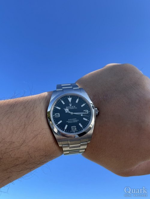 僕は未使用のロレックス エクスプローラー1 214270を探してました。クォーク横浜店さんの在庫が最安値だったので購入を決めました。石橋さんや濱松さんの対応がとてもスピーディで良かったです。僕の腕は太く36mmのエクスプローラー1ではレディースに見えるので39mmの214270が1番最適です。ロレックスの中でもシンプルなモデルなのでオンオフ問わず着用できるのが1番の魅力です。これからも時計を買うならクォークさんで買おうと決めました。