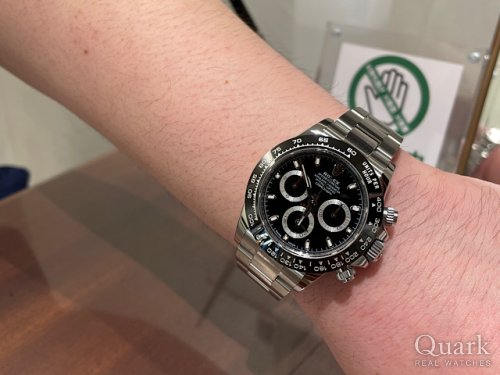I様 この度は数ある時計店の中からクォーク上野本店をご利用いただき誠にありがとうございます。DAYTONA Ref.116500LN(黒)のご購入と奥様からのGOサインおめでとうございます!ラッカー仕上げが施された黒文字盤に加え、インダイヤルの目盛り部分は落ち着いたマット仕上げになっているのが良いですね!また、いやらしさが感じられず、高級感を感じさせる鏡面仕上げのブレスレットもロレックスの拘りを感じますね。ブレスレットの洗浄及び調整も無料で行っておりますので、お近くにお越しの際は遊びにいらしてくださいませ。お使いいただく上で何かご不明な点等ございましたら、また林までご相談ください。今後とも末永いお付き合いの程よろしくお願いいたします。