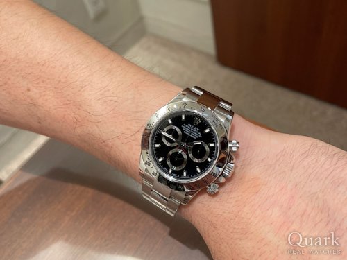 N様 いつもクォーク上野本店をご利用いただき誠にありがとうございます。この度、ご購入いただきましたDAYTONA Ref.116520(黒)は2000年に発売が開始され、2016年に生産が終了するまでに多くのマイナーチェンジが行われているモデルとなります。高級感が感じられる黒色の文字盤に加え、性能面も向上しており、非常に使い勝手の良いお時計でございます。数多くのロレックスファンを魅了する素敵なお時計をN様へご紹介出来た事、嬉しく思います。ブレスレットの洗浄及び調整も無料で行っておりますので、お近くにお越しの際は遊びにいらしてくださいませ。お使いいただく上で何かご不明な点等ございましたら、また林までご相談ください。今後とも末永いお付き合いの程よろしくお願いいたします。