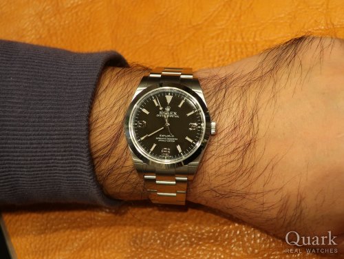I様 この度はクォーク仙台店をご利用くださいまして誠にありがとうございます。39ミリケースの絶妙なサイズ感が合わせやすい「Ref.214270 エクスプローラーI」とてもお似合いでございました。沢山お時計をお持ちのI様のコレクションに、素晴らしい1本が加わりましたね。インデックス369部分にラインが入らないメタルのみの仕様は、レアモデル「ブラックアウト」を彷彿とさせる、素敵なデザインです。また、マイナーチェンジ直前の仕様である「鏡面仕上げ」の中板も嬉しいポイントですね。これからもしっかり対応いたしますので、どうぞよろしくお願いいたします。ご紹介くださいましたI様にもお礼申し上げます。是非お二人で遊びにいらしてください。