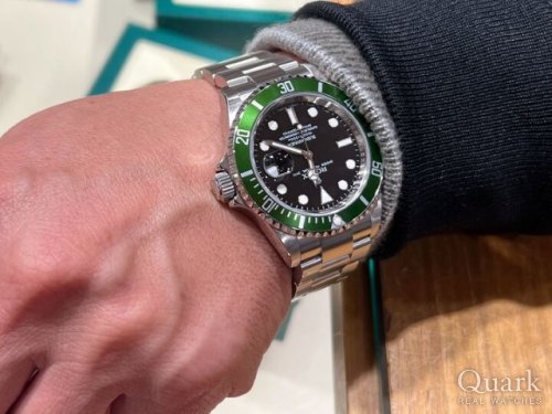 H様、この度はクォーク梅田店をご利用頂きまして誠に有難うございました。日頃より御愛顧下さり心より感謝を申し上げます。この度お選びいただきましたのは、サブマリーナー(Ref.16610LV)でございます。初代グリーンサブですね。コンディション抜群でベゼルカラーも何にでも合わせていただけるお色です。ベゼルのお色目で雰囲気やイメージもかなり変わってきますのでとても悩まれましたね。最後の方は私もごり押しをしてしまいましたが(笑)、購入後にこの個体で良かったと言って頂けてホッと致しました!!またH様の素晴らしいコレクションがさらに彩りましたね。本当にお似合いで素敵でしたので、末永くご愛用頂けましたら幸いです。今後もH様にお喜び頂けますよう最大限サポートに努めますので、何なりとご用命くださいませ。今後とも変わらぬご愛顧のほど、何卒宜しくお願い申し上げます。