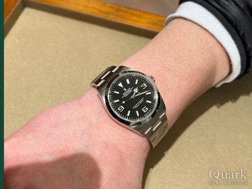 H様 この度は数ある時計店の中からクォーク上野本店をご利用いただき誠にありがとうございます。36mmのEXPLORERをずっと探していたとの事でご希望に添ったRef.124270をご紹介出来た事嬉しく思います。文字盤はサテン仕上げからラッカー仕上げに変更され、EXPLORERのロゴは6時位置から12時位置へ移動し、更にインデックスや針も最適化され、高級感が向上しております。40mmサイズのお時計とは違った雰囲気を楽しんでいただけますと幸いです。ブレスレットの洗浄及び調整も無料で行っておりますので、お近くにお越しの際は遊びにいらしてくださいませ。お使いいただく上で何かご不明な点等ございましたら、また林までご相談ください。今後とも末永いお付き合いの程よろしくお願いいたします。