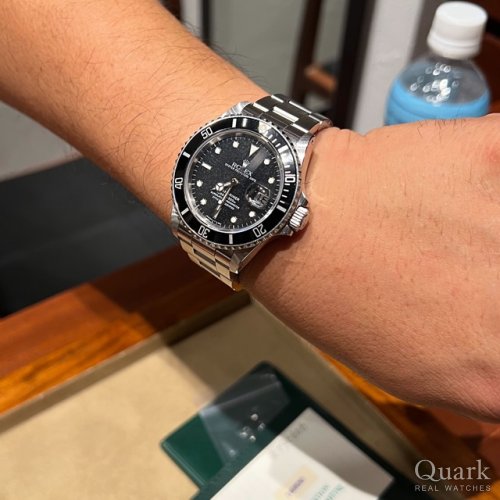 念願のサブマリーナーを手にすることが出来ました。以前からの憧れのモデルで、いつか手にしたいと思っていました。しかし、だんだんと金額も上がり、気付はモデルチェンジし色々な理由で購入するタイミングを逃していましたが、納得できる個体と巡り合えて購入を決断することが出来ました。取り寄せしてもらい最寄りのクォークで見ることが出来て安心して購入することが出来ました。