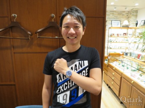 S様、この度はクォーク梅田店をご利用頂きまして誠に有難うございます。以前になんば店でご対応させて頂いて以来、念願の青サブを手に入れて頂き本当に良かったです。1年間温めてこられたお気持ちの分、お喜びも大きいかと思います。ダイヤル・ベゼルの鮮やかなブルーとイエローゴールドの組み合わせがとても華やかですね。今後ともS様に安心してご使用頂けるようにしっかりとサポートさせて頂きますので、末永いお付き合いの程宜しくお願い致します。